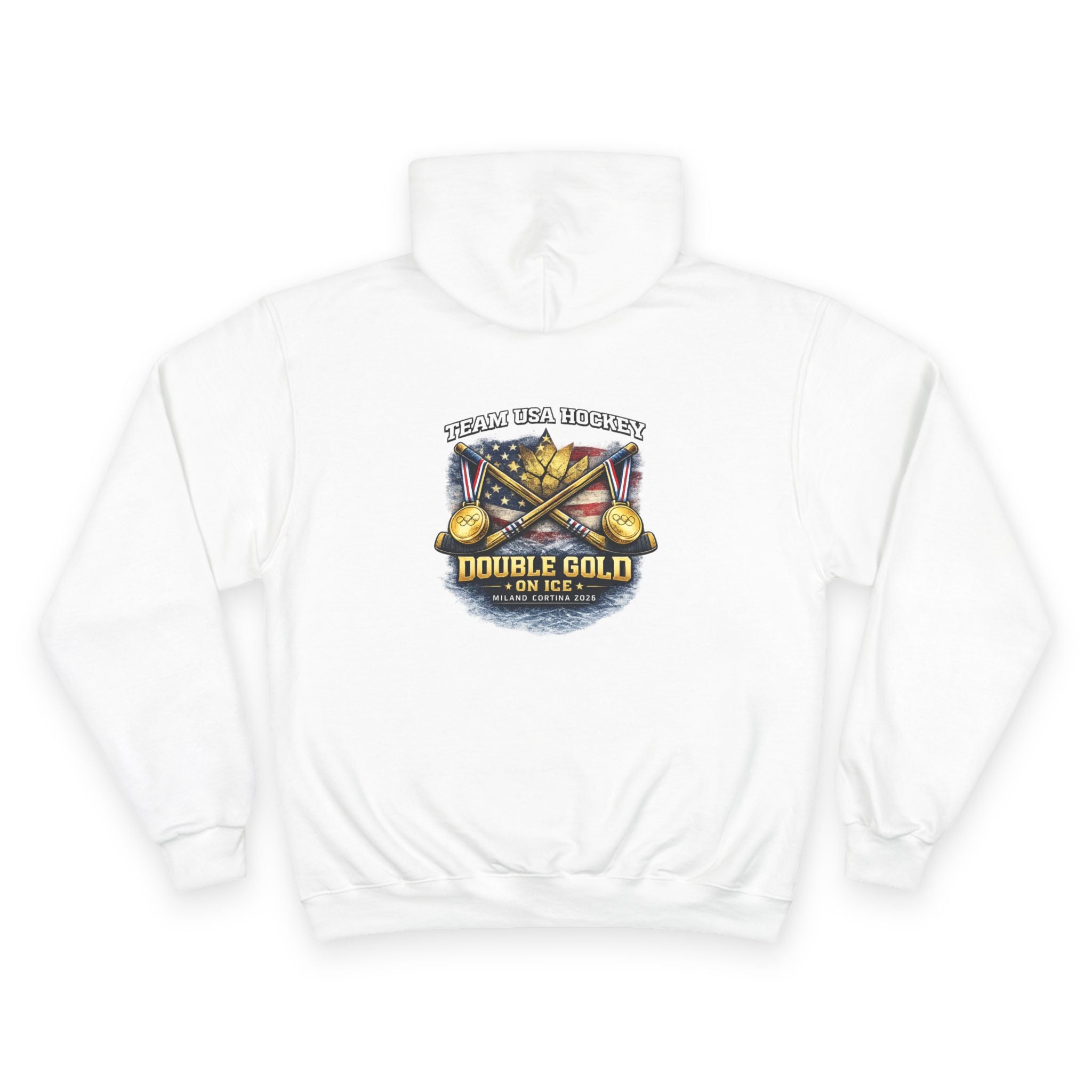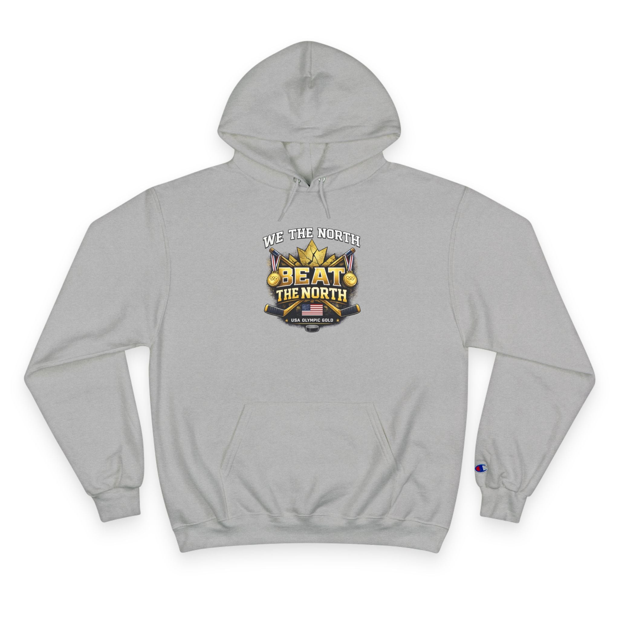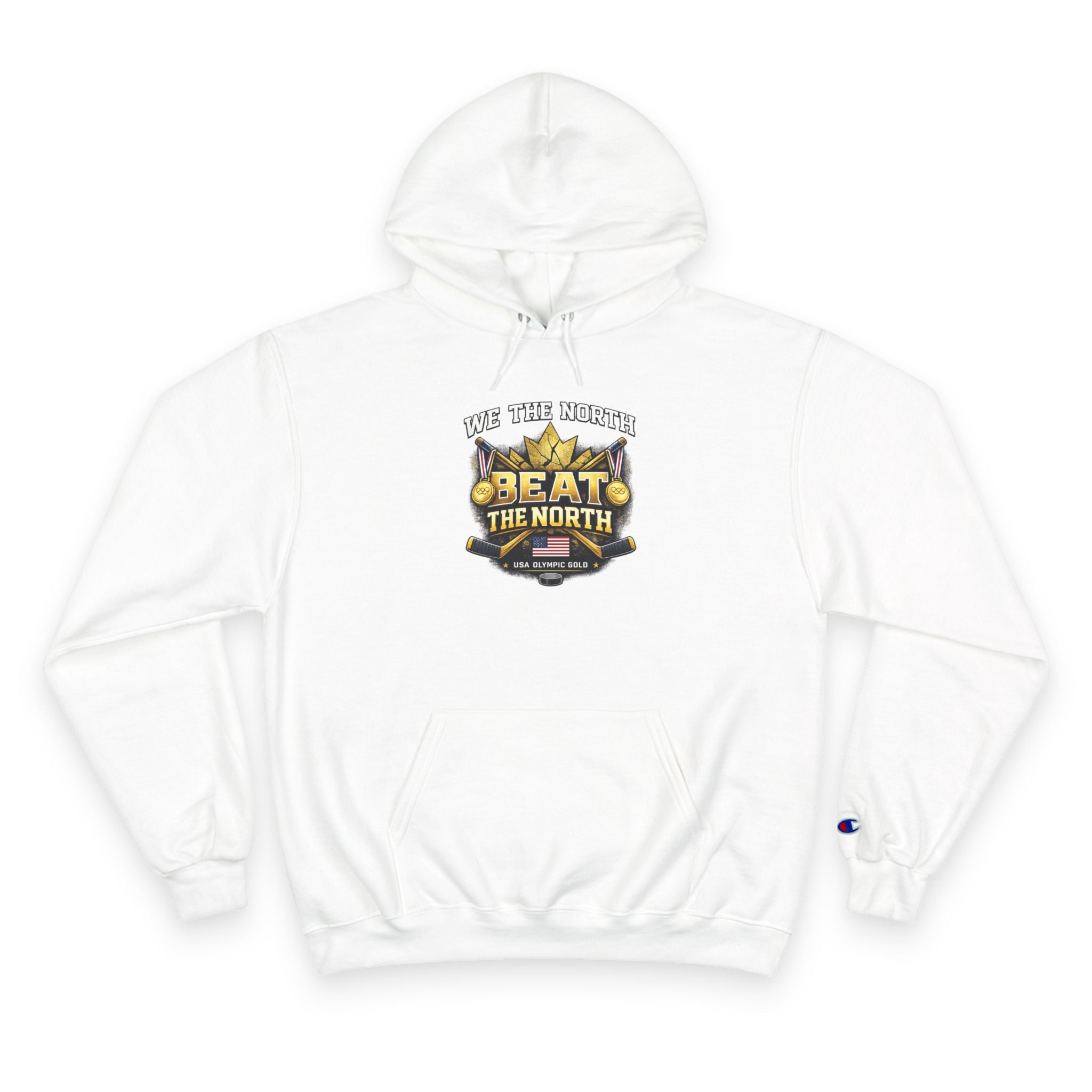 “We The North Beat The North” hoodie celebrating USA Hockey’s 2026 double gold victory. High-quality sports hoodie featuring hockey-themed graphics, bold gold medal design, and championship streetwear style.